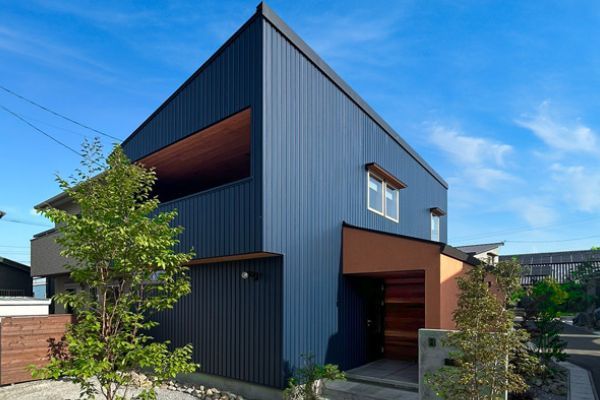 ブルーのガルバリウム外壁と、暖色系の塗り壁に植栽が映えるファサード。凛とした表情が際立ちます。
