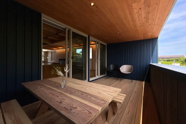 深い軒でまもられたルーフバルコニーは、雨の日もソトをたのしめる空間。夏の日差しもカットして、心地よい空気が流れます。