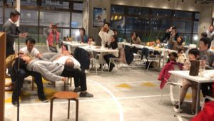 お客様の住まいづくりに情熱を注ぐフォレストスタッフが、夜な夜な練習していた(らしい)『4人空気椅子』のお披露目です。4つの丸椅子にフォレストスタッフが座り、1脚づつ丸椅子が外されていきます。
