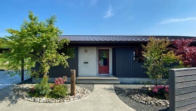 ブラウンの外壁にアクセントのグレーの塗り壁、木製ドアがマッチした外観。 玄関アプローチに植栽された木々やピンクのお花がゲストを誘います。