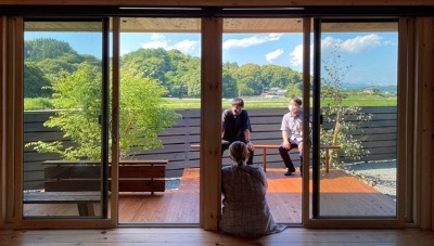 ウッドフェンスの適度な高さが落ち着きと、その上に抜ける景色が開放感を生みます。