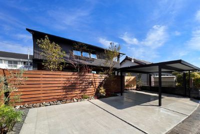 住宅地の中にキラリと光るガルバの外観と美しい植栽が絶妙にマッチした玄関アプローチ。