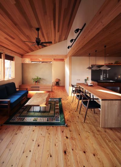 建物内部に足を踏み入れ2階へとつづく階段を上がった先に広がる開放的なリビング空間。