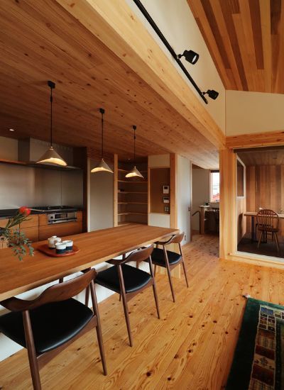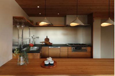 L字型キッチンとつながる一枚板のダイニングテーブルへの動線はお客様から好評いただきました。