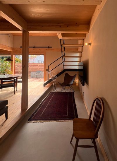 モルタルの素材感、自然なグレーと無垢材の相性も抜群です。