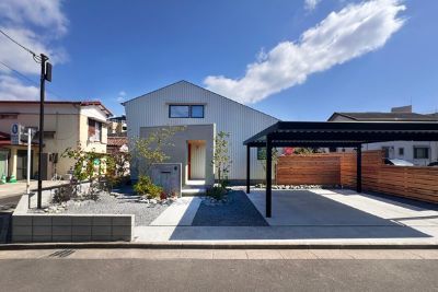 玄関周りの木々のグリーンが外壁に映えます。