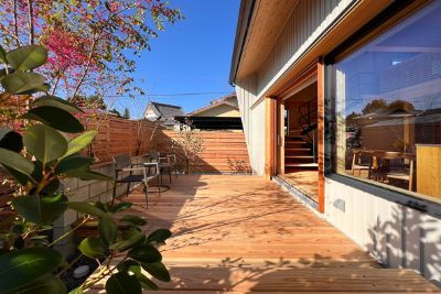 ナチュラルな色のウッドフェンスとテラス、経年での色の変化も楽しみです。