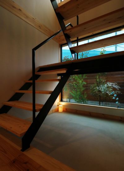 玄関から階段へと続く土間空間は、外の植栽を眺めながら階段の上り下りも楽しくなりそうです。