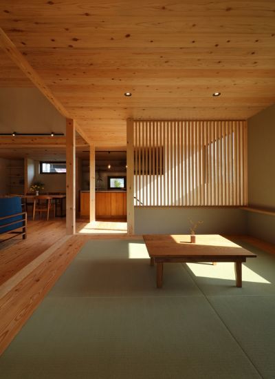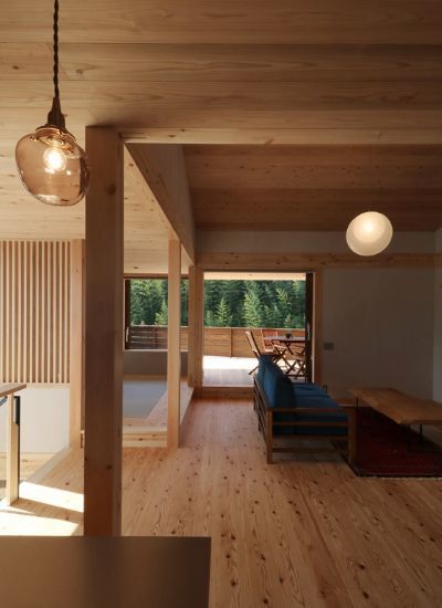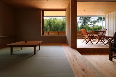 2階に配置されたリビング。窓の外に見えるのは、青空と竹林の借景。