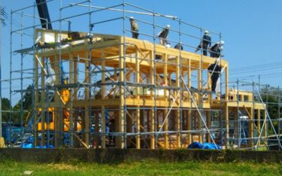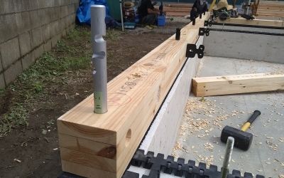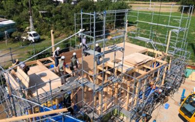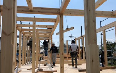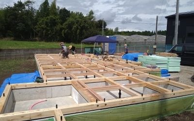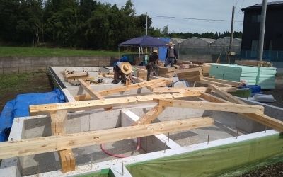 土台が搬入され、現場では大工さん達が炎天下のもと本体のベースとなる土台をつくります。