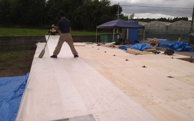 建て方時に組まれた構造材に耐力壁となる面材を貼り合わせていきます。