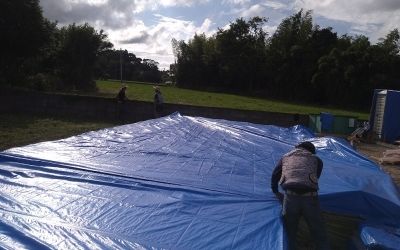 仕上げに床パネルを覆うようにしっかりと雨養生を行います。