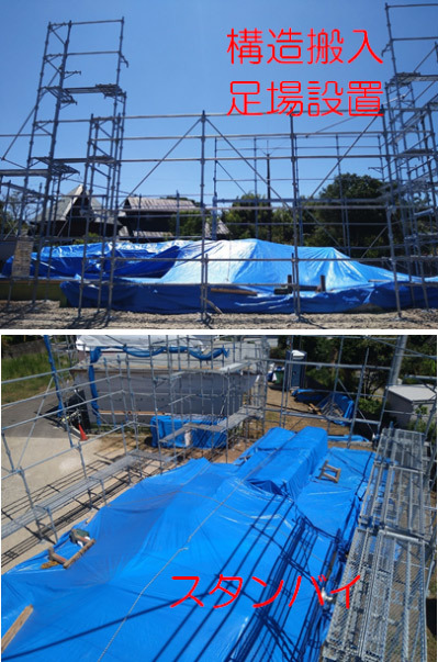 構造材の搬入と足場の設置です、いよいよスタンバイに入ります。