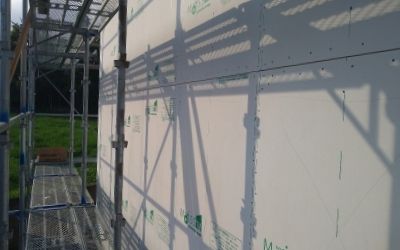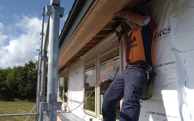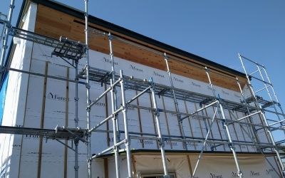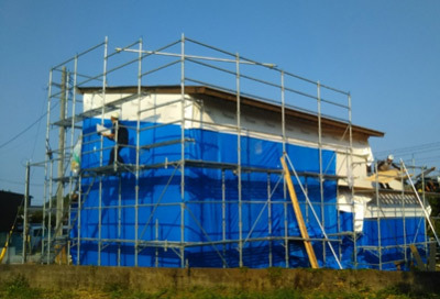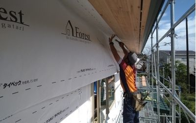 現在、白いタイベックシートを外壁面すべてに貼り合わせています。