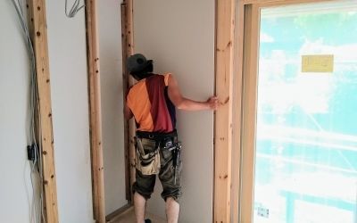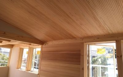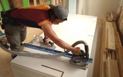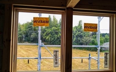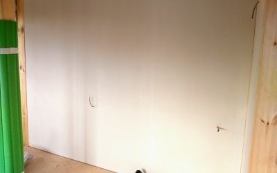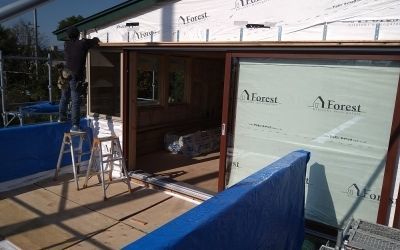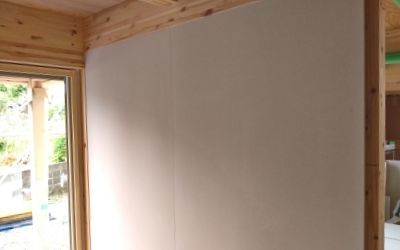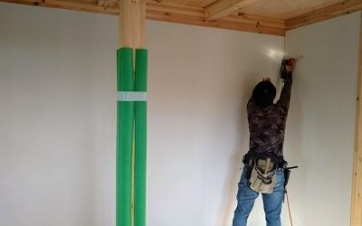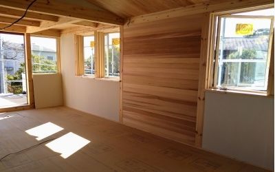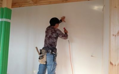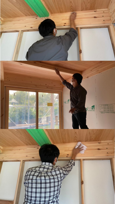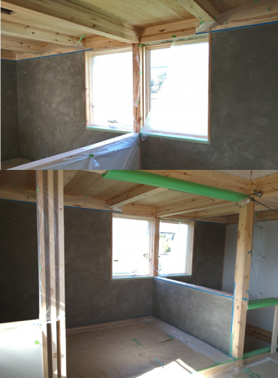 すべてのサッシが納まり、第三者機関JIOによる構造検査に合格した Air living は、内部の壁仕上げ施工へと移りました。