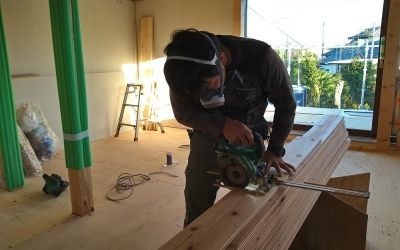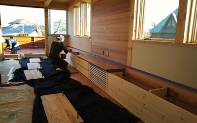 建物内部の最後のひと手間、自然塗料のオイル仕上げ。