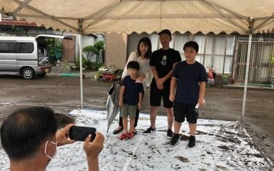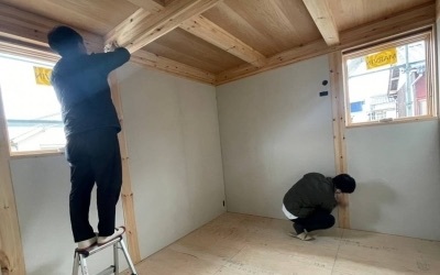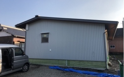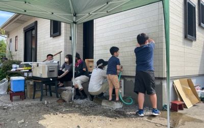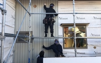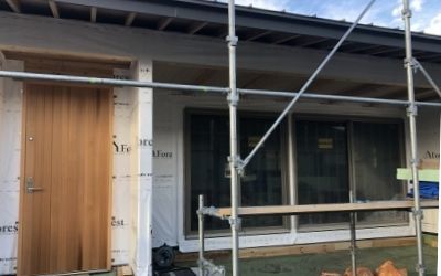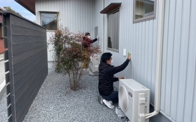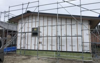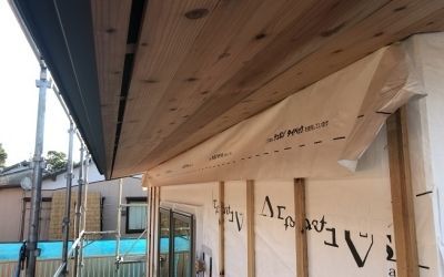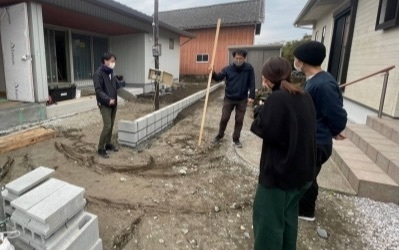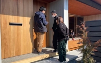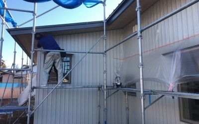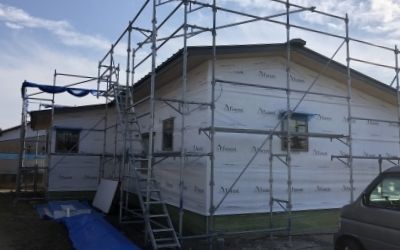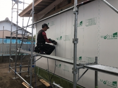 建て方工事を見学されていたお施主様のお子様たちが、屋根工事と並行するようにご実家の壁の清掃を自発的にスタート✨
