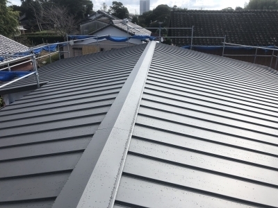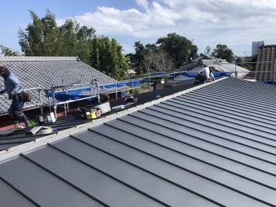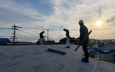 休憩をはさんで、屋根の防水下地をしっかりと施工します。