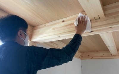 『木の温もり』を感じていただくために、柱や梁を丁寧に磨きます。