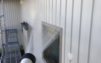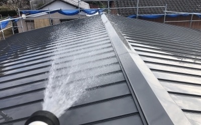 足場の解体前に、屋根・外壁の洗浄、チェックを行いました。