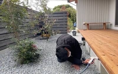 デッキ下に残った鋸くずやほこりを洗い流します。