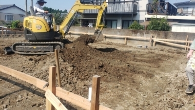 まずは手慣れた重機捌きで土の搬出をし地盤を整えていきます。