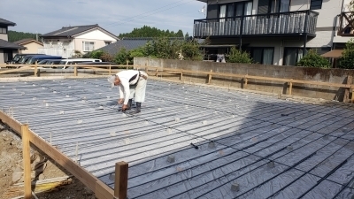 鋤取り後、砕石を敷き均し転圧~防湿シートを張り配筋作業へ。