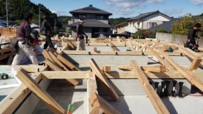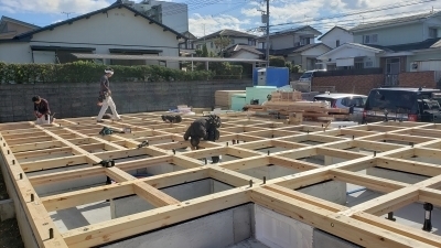 熟練の大工さん達により快調なペースで碁盤目状に大引きが組まれていきます!