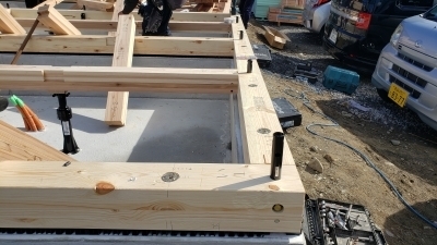 まずは埋め込んだアンカーボルトで基礎と土台を緊結していきます。