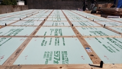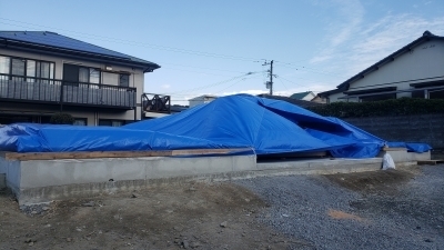 さらにその上からブルーシートでしっかりと雨養生し土台敷きの工程が完了しました!