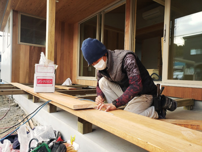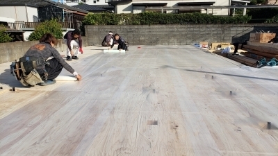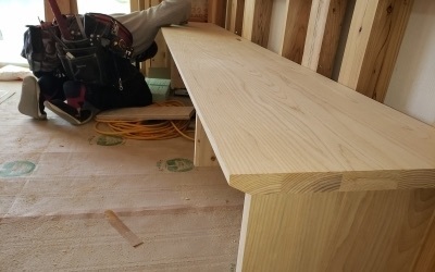 建物内部の方でも浮造りの床板施工、造作工事も順調に進んでいます。