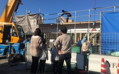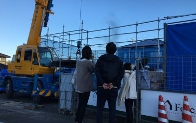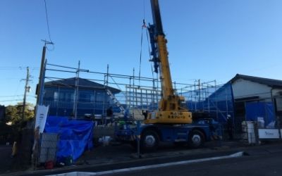 朝晩の冷え込みに拍車がかかる11月末、朝一番から駆け付けて頂きましたお施主様が見守る中建て方開始です。