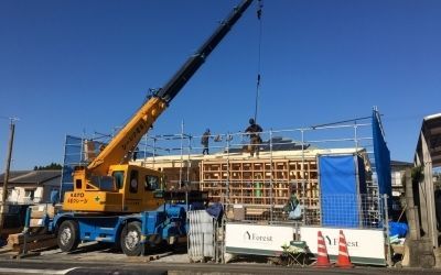大工さんの合図一つ、クレーン車で的確に運びこまれる構造材。