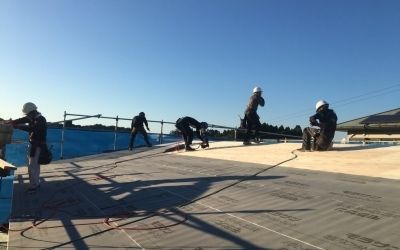屋根を雨風から守る防水シートで丁寧に覆っていきます。