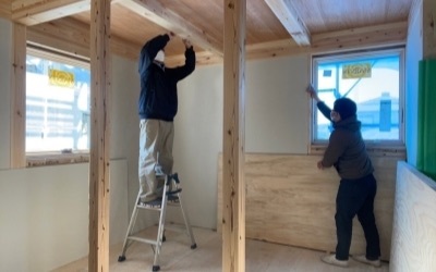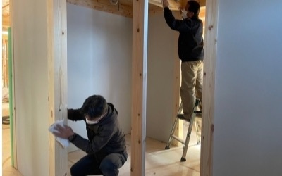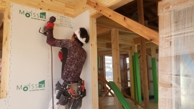 建物内部では、棟梁のK大工さんがモイス壁を丁寧に仕上げています。