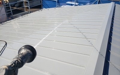 足場解体を前に恒例の屋根・壁洗浄を行いました。