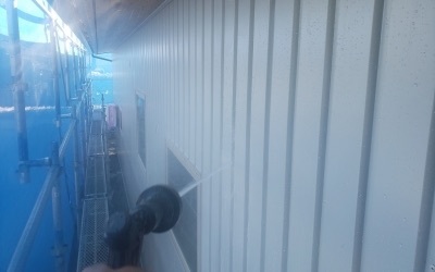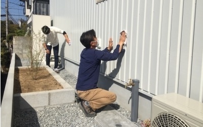 洗浄を行いながら外部の施工状況の最終点検も同時に行います。