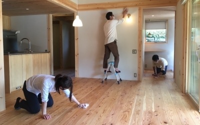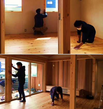 柱や梁、床や壁、造作棚など一つ一つ丁寧に磨きながら確認作業が行われます。