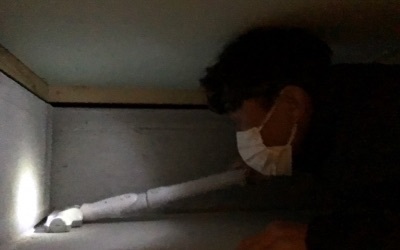 現場責任者のKさんは床下へ潜りこみ、土間コン磨きをしながら水漏れなどの不具合がないか細かな点検を行います。