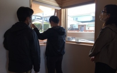 まずは現場の総指揮官K監督が、お施主様に実践して頂きながらサッシや建具の取扱い方を丁寧に解説していきます。