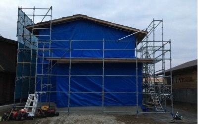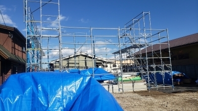 後日、構造材の搬入・仮設足場の設置も完了しました。
