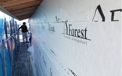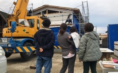 朝一番から駆け付けて頂きましたお施主様も、最終工程の屋根仕舞いとお家を丁寧に覆うラッピングの完成を見守ります。