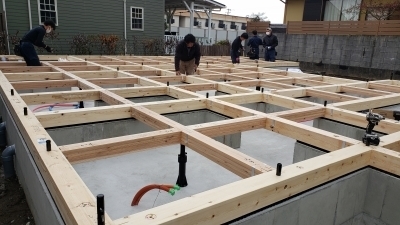 土台が組まれたらその間に大引きを碁盤目状に組んでいきます。