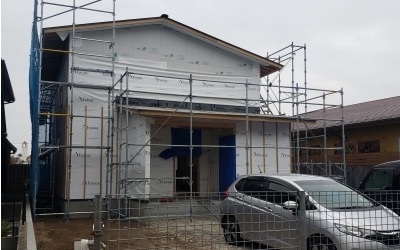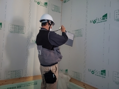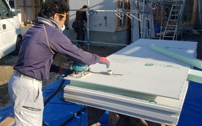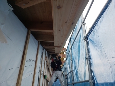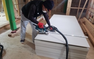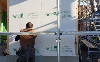 建て方後、最初に行うのが耐力面材となるモイスの施工を行います。