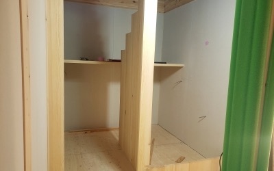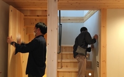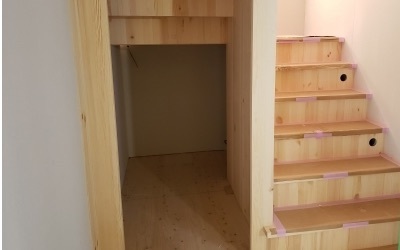 内部工事が少しずつ進んでいます「Green room」 現場では造作階段が完成しました。
