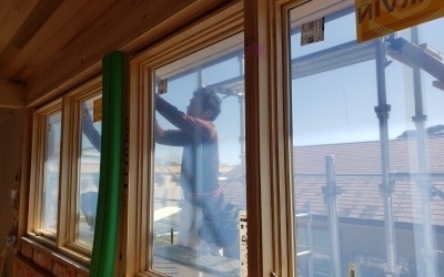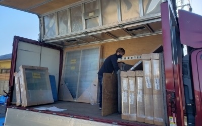 アメリカのミネソタ州で制作され長い旅路を経てようやく納入となりました。 がっちりと養生された大小様々な木製サッシ。