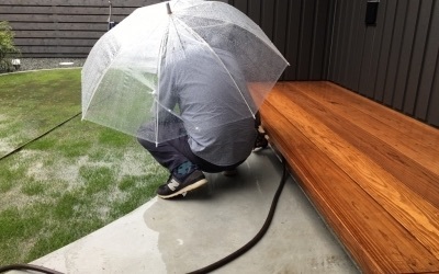 最後に透明の養生シートを丁寧に張り雨露・汚れなどから土台を守ります。