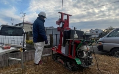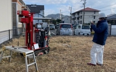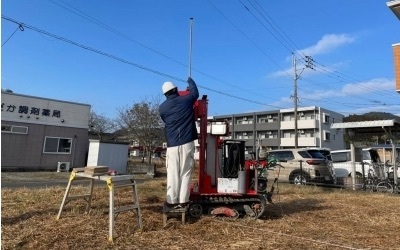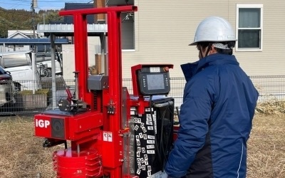 地盤調査専用の機械で、建物が建つ予定のエリアを調査します。