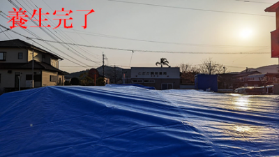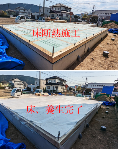 構造材を搬入し、隅々まで養生をしっかりと施して土台敷きの工程が終了となりました。