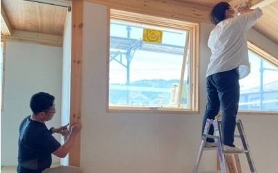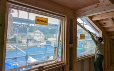 一つひとつの木製サッシを丁寧に確実に取り付けていきます。